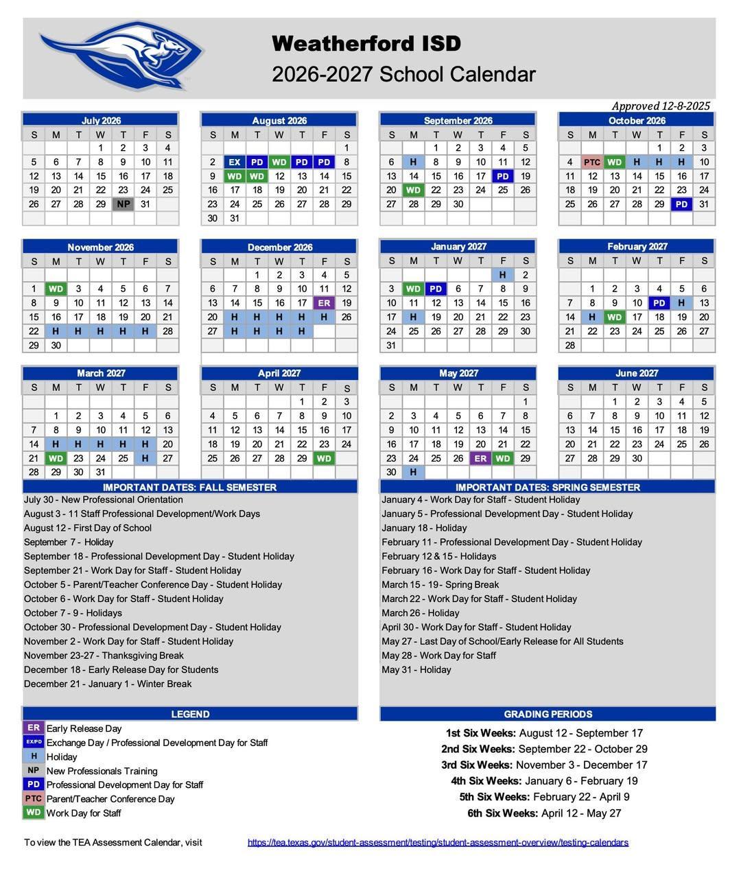 Weatherford ISD is excited to share the official school calendar for the 2026-2027 school year. Whether you're planning family vacations, looking ahead to important school dates, or simply getting organized, this calendar has everything you need. Download the calendar directly from our website here: www.weatherfordisd.com/calendars/